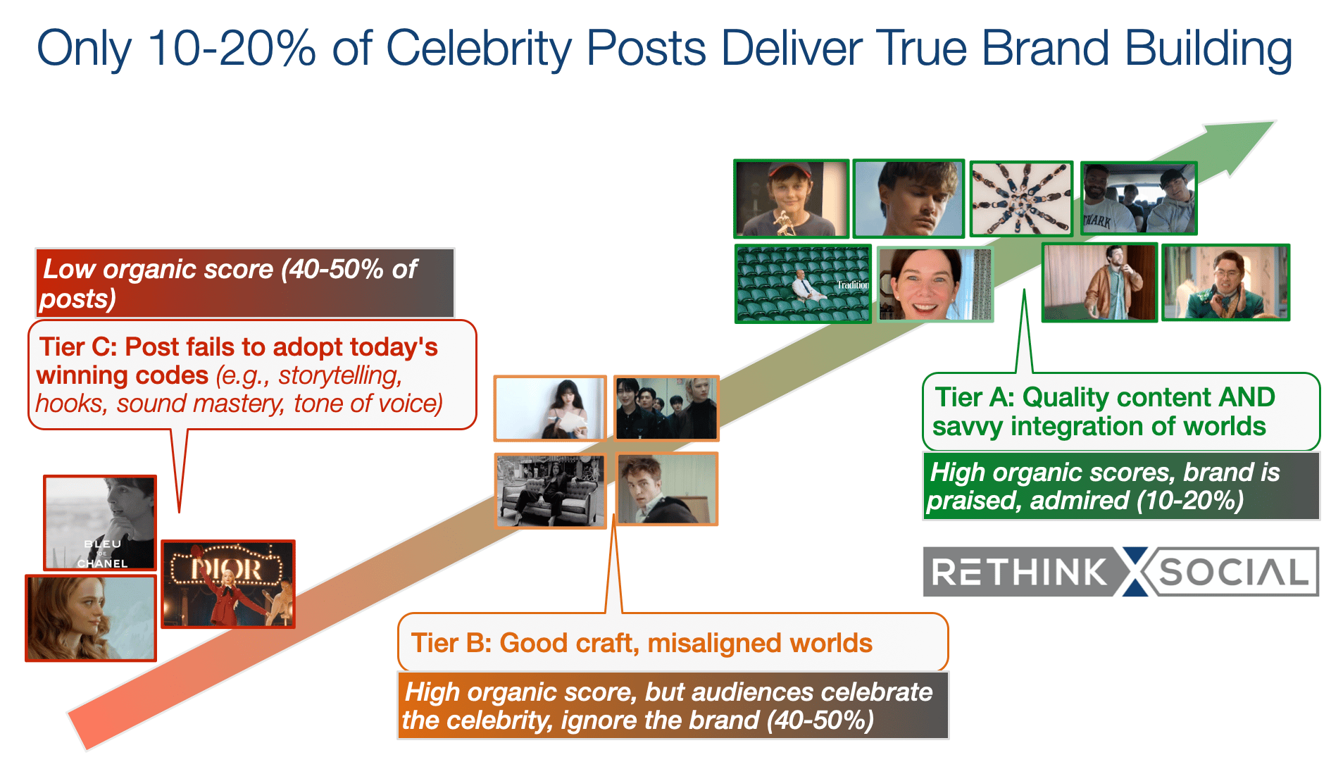 Even when the content gets today’s codes right, it often stumbles into Tier B: the celebrity is force-fit into the brand's world. The numbers look good, but a closer look reveals >95% of discussions focus on the celeb, not the brand.